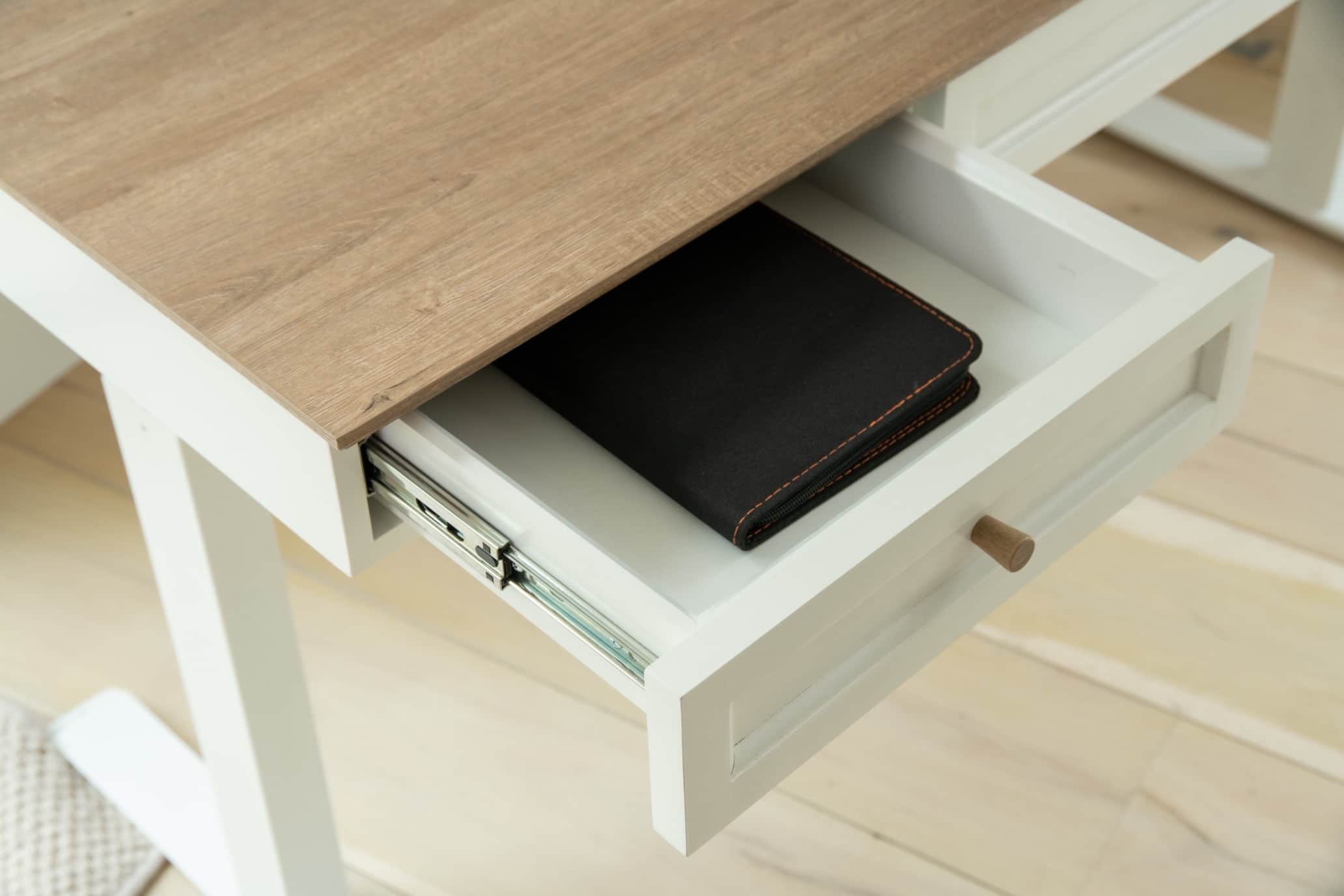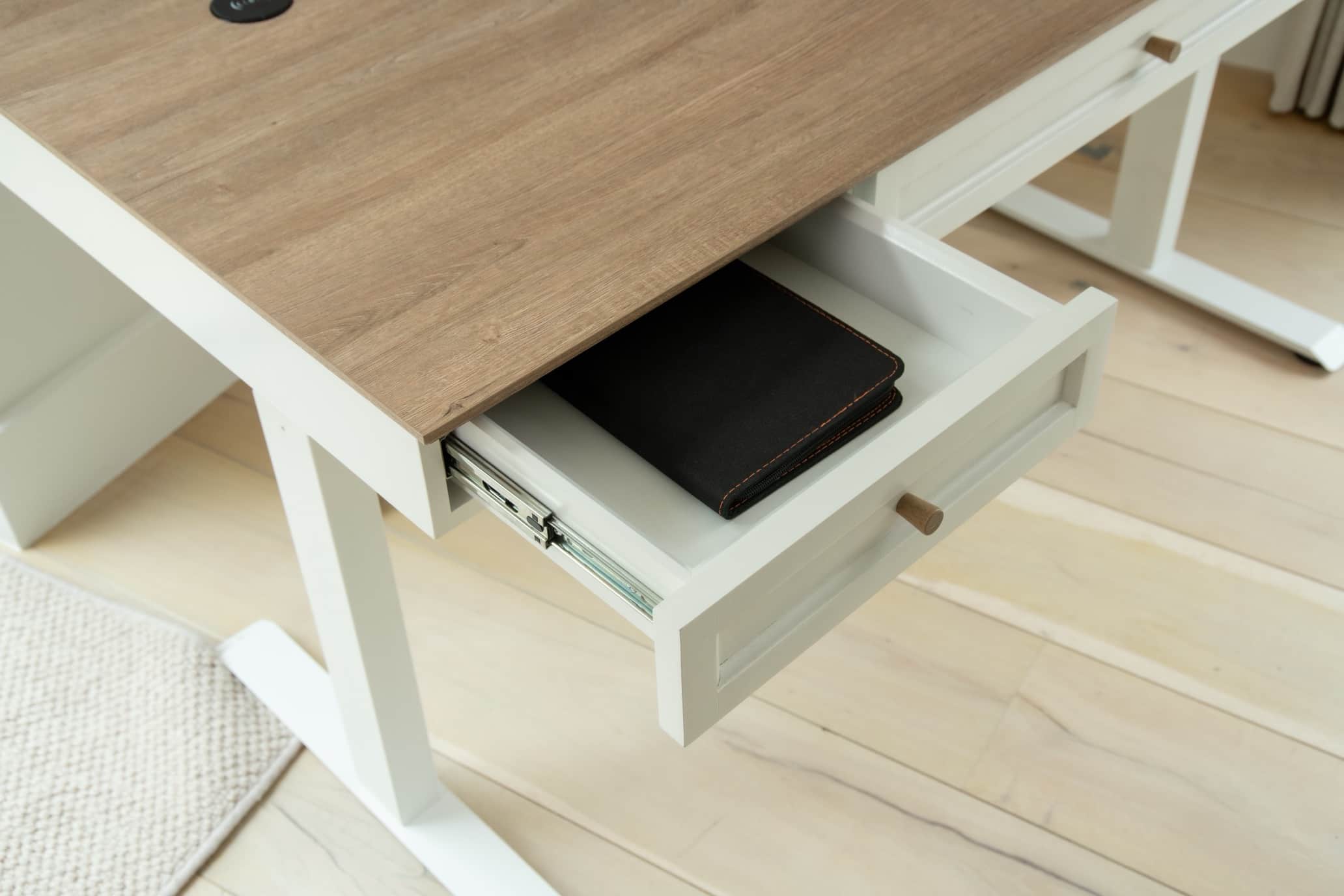 Combines classic style with modern tech. Featuring a natural ash wood top, soft white painted drawers and legs, and matching wood handles, it brings a clean, elegant look to any workspace. The extra-wide 1.5m worktop offers plenty of room, while the hidden flip-top compartment keeps cables and power neatly tucked away. Stay connected with integrated QI wireless charging, USB and USB-C ports, and three AC sockets. The height-adjustable frame is controlled by a sleek digital screen with sit/stand reminders, and the desk includes one large drawer and two smaller ones for practical storage.