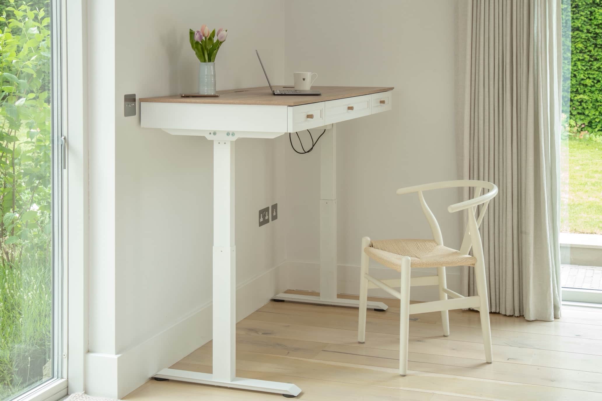 "Create a stylish and productive workspace while saving money when you buy these two designs together. This bundle pairs the Felix Height Adjustable Smart Desk with the beautifully designed Frida chair for a coordinated, modern home office. The Felix desk allows you to switch effortlessly between sitting and standing for a healthier way to work, while its clean contemporary design keeps your workspace looking sharp. Paired with the Thea chair — featuring soft grey upholstery, natural wood-accented armrests and a supportive high back — the two designs complement each other perfectly, combining smart functionality with elegant Scandinavian-inspired style."