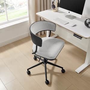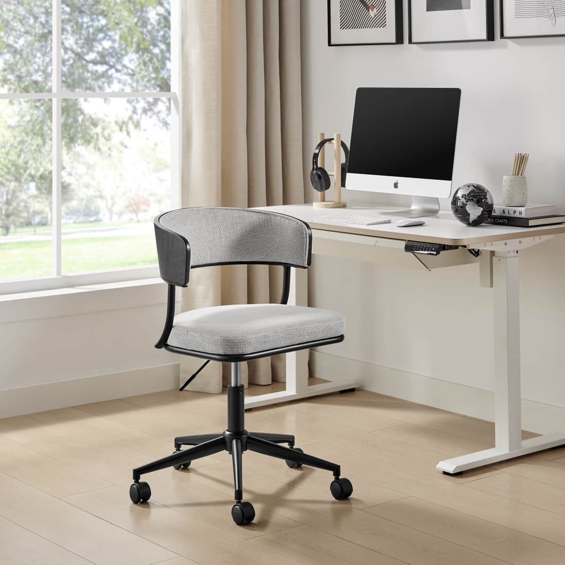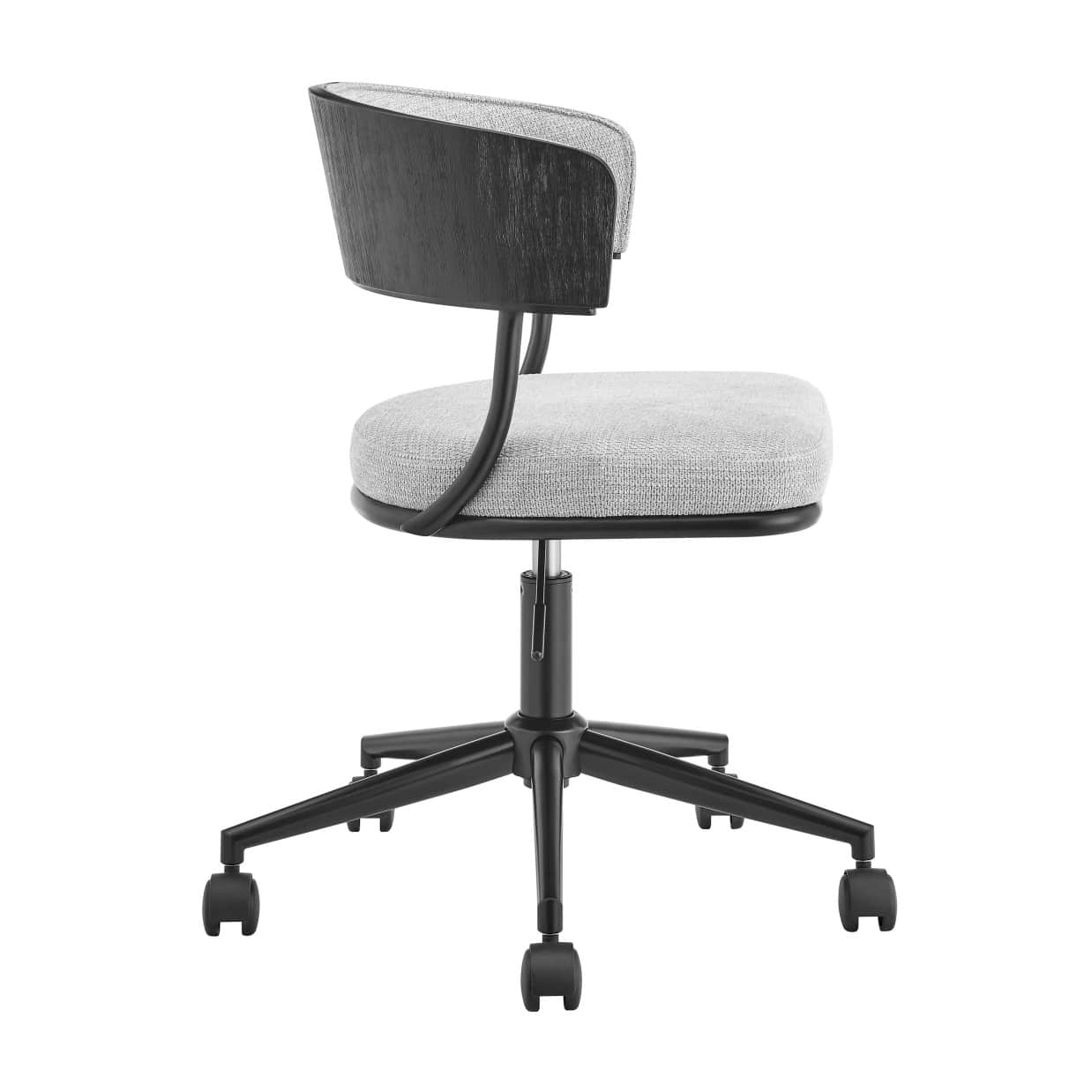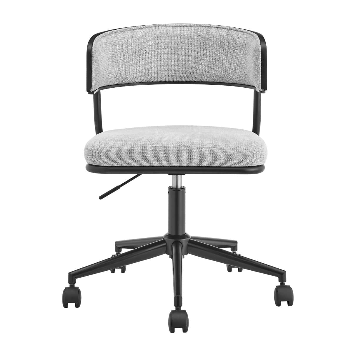 A stylish, modern office chair featuring a curved upholstered backrest, plush light grey seat cushion, and matte black metal frame with matching five-star base. Height adjustable with smooth-rolling castors— ideal for home office