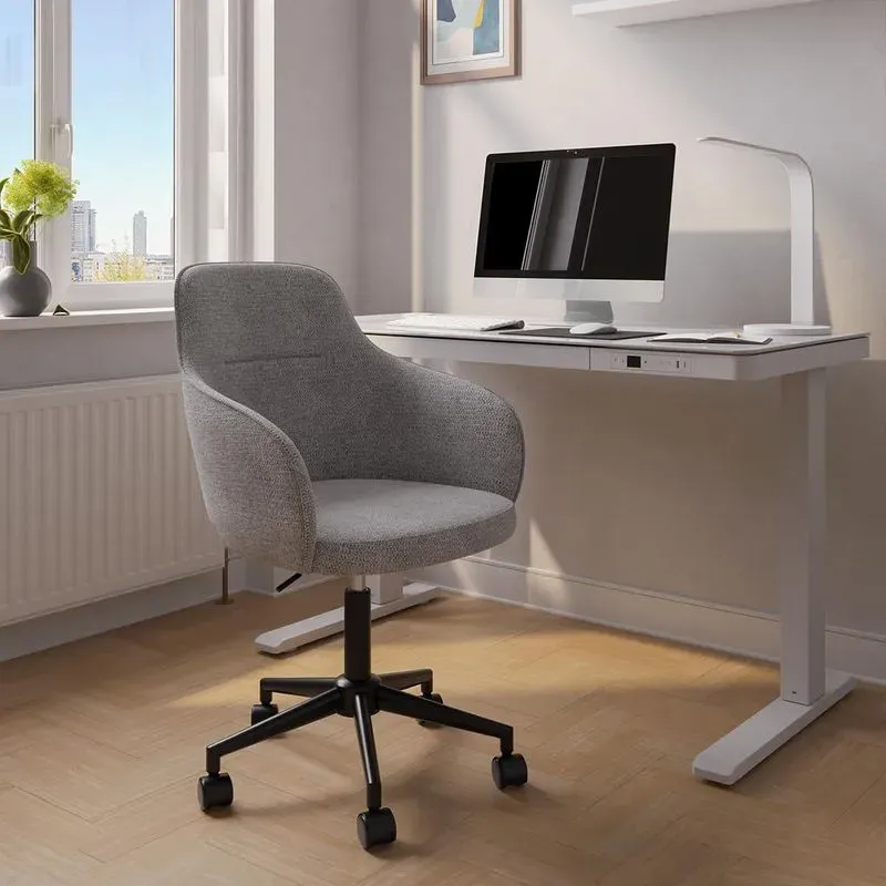 The Stand up tech bundle - The Juno 4.0 in White and the Alma Home Office chair are the perfect combination of tech and modern style. Juno desk Version 4.0 Upgraded tech features include magnetic charging station ( UK exclusive ) and more powerful USB-A and USB-C charging points, capable of charging most small to medium sized laptops. Digital control panel with LED screen allows seamless transitioning from sitting to standing and memory functions allow you to store your favourite heights for working. Alma is Upholstered in pale grey chunky weave fabric with matching piping. Includes gas lift height adjustment supported on a sturdy 5 spoke black metal base with wheels.