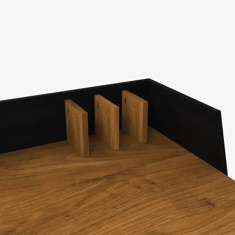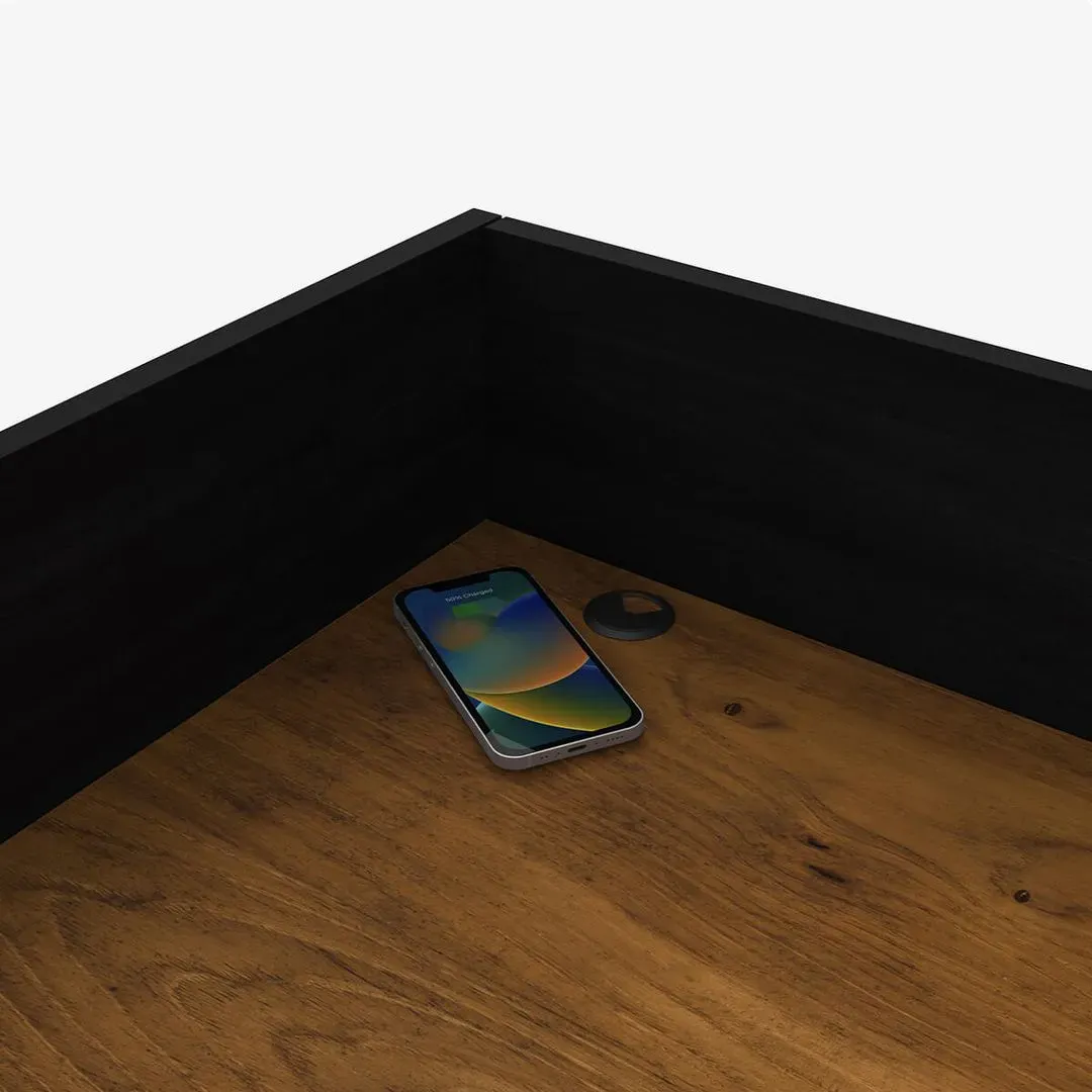 Kennet keeps it functional whilst creating a modern home working space. Smart features include integrated desktop wireless charging, helping you keep your compatible device topped up with battery throughout the working day. The wrap around design and dividers help keep your documents and work essentials organised. Kennet blends oak and black finishes with black contemporary metal sleigh legs. Includes power cable with UK compatible 3-pin plug (1 socket required).