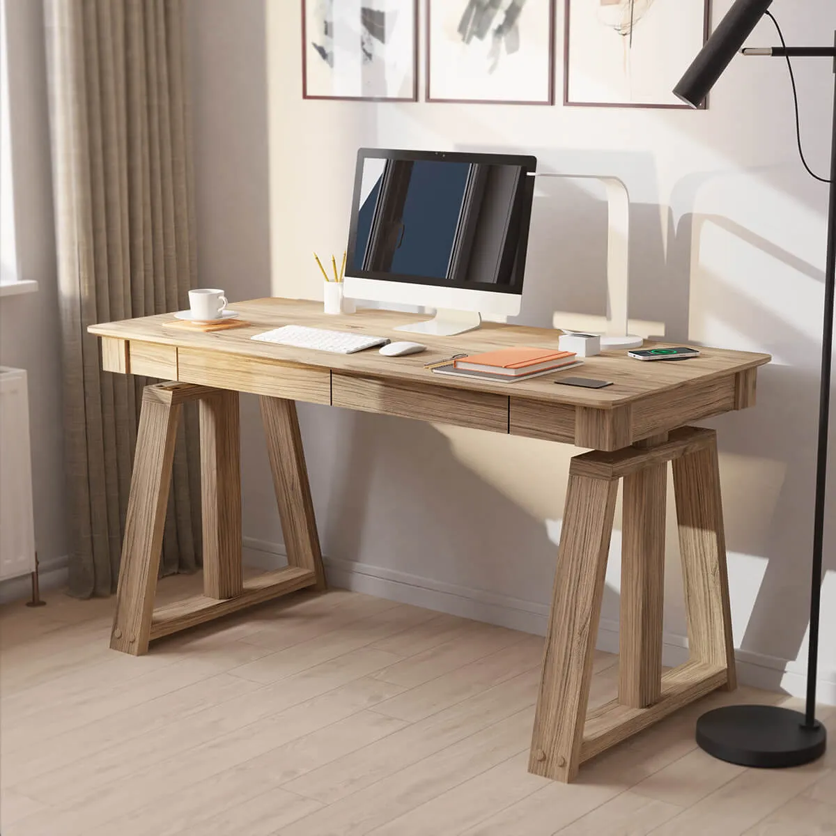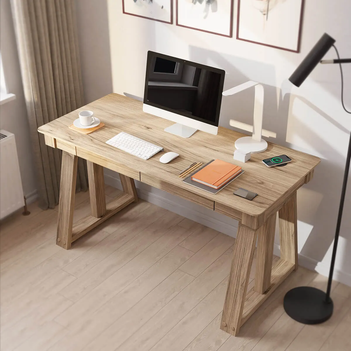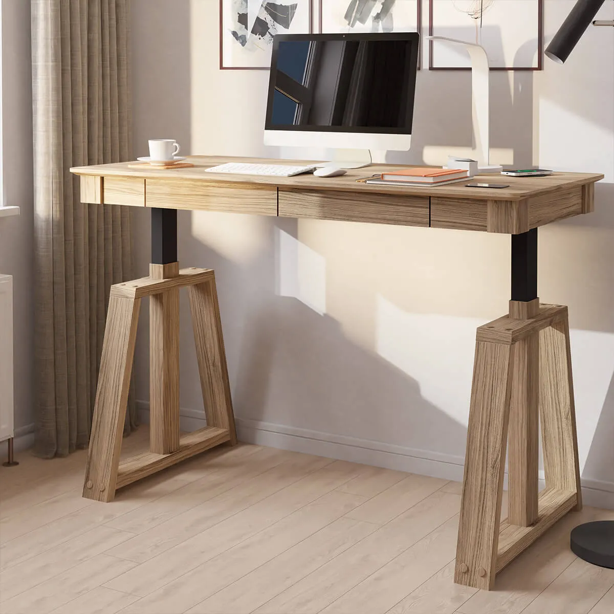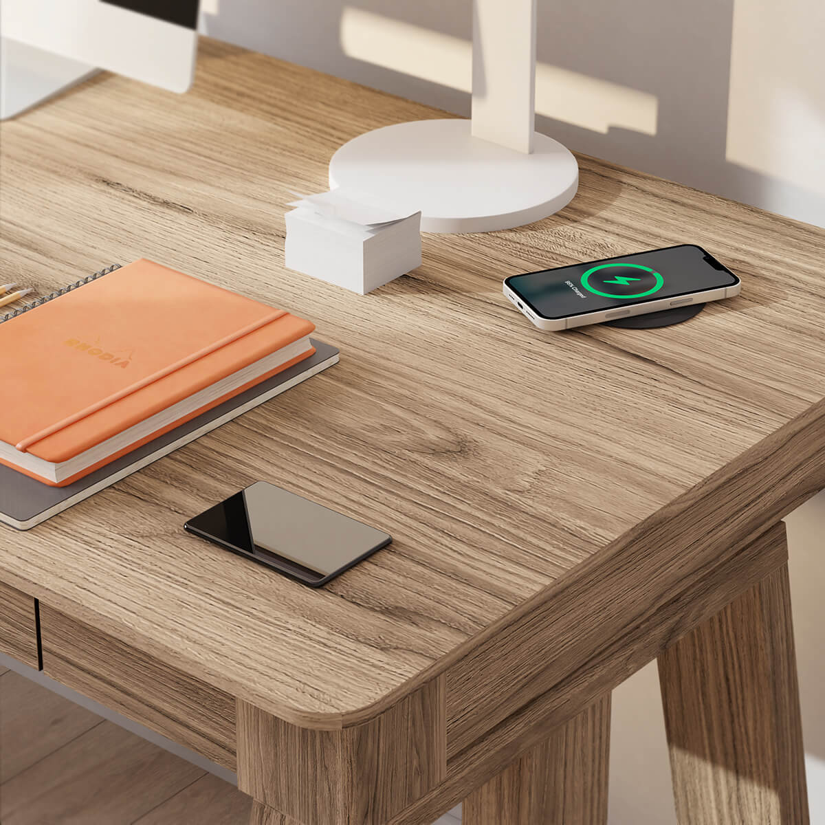 Make a statement with the Nora height adjustable desk. Select your perfect working position & set daily reminders from the sleek digital control screen. Nora desk has been designed for a more traditional work station, complimented with a natural ash finish and distinctive patented legs. Two drawers provide ample storage for documents or stationary. Keep your devices powered using the integrated desk top QI wireless charging point, powerful USB-C and USB - A charging points or 3 x hidden DC charging sockets. Dual motors ensure a smooth and quiet transition between sitting and standing.
