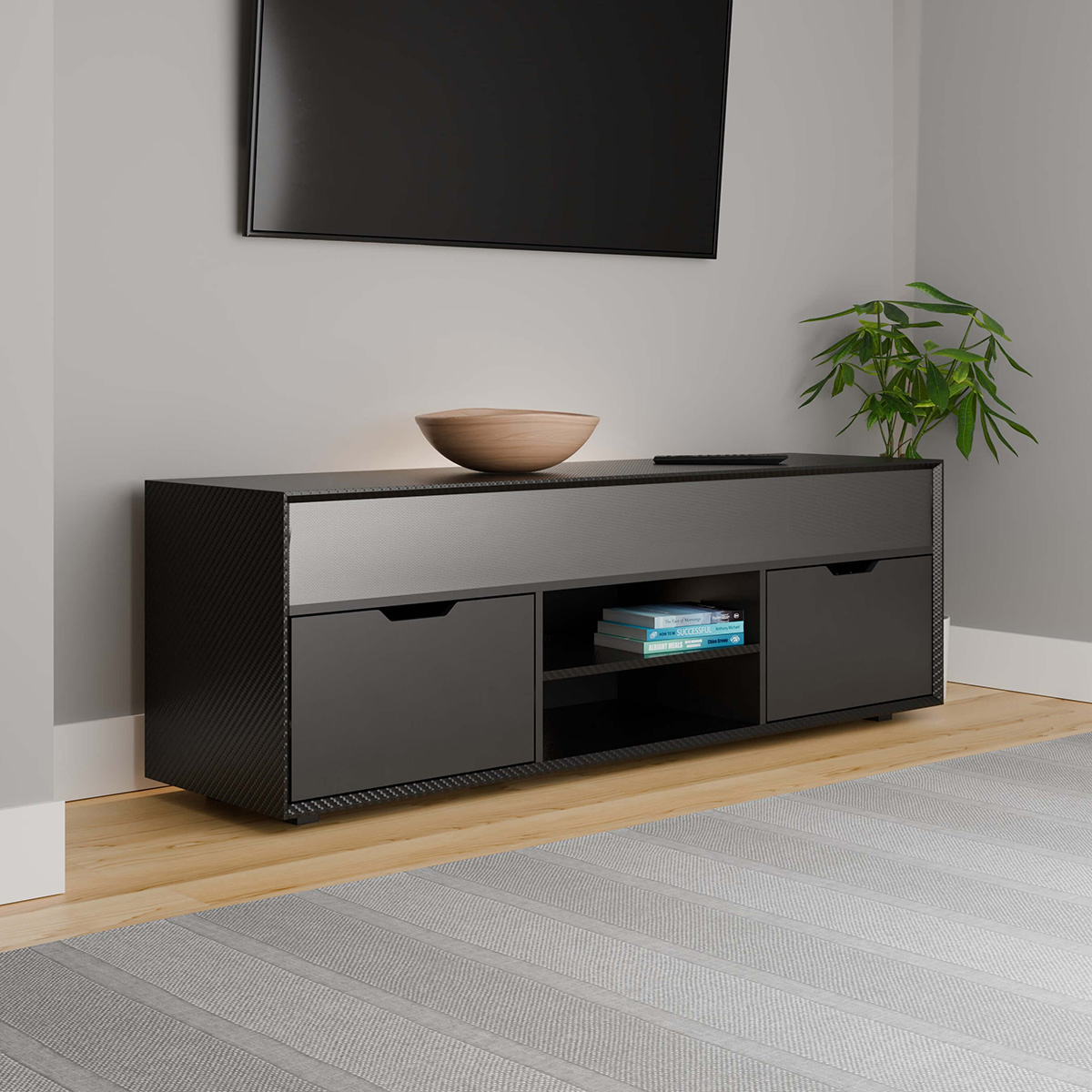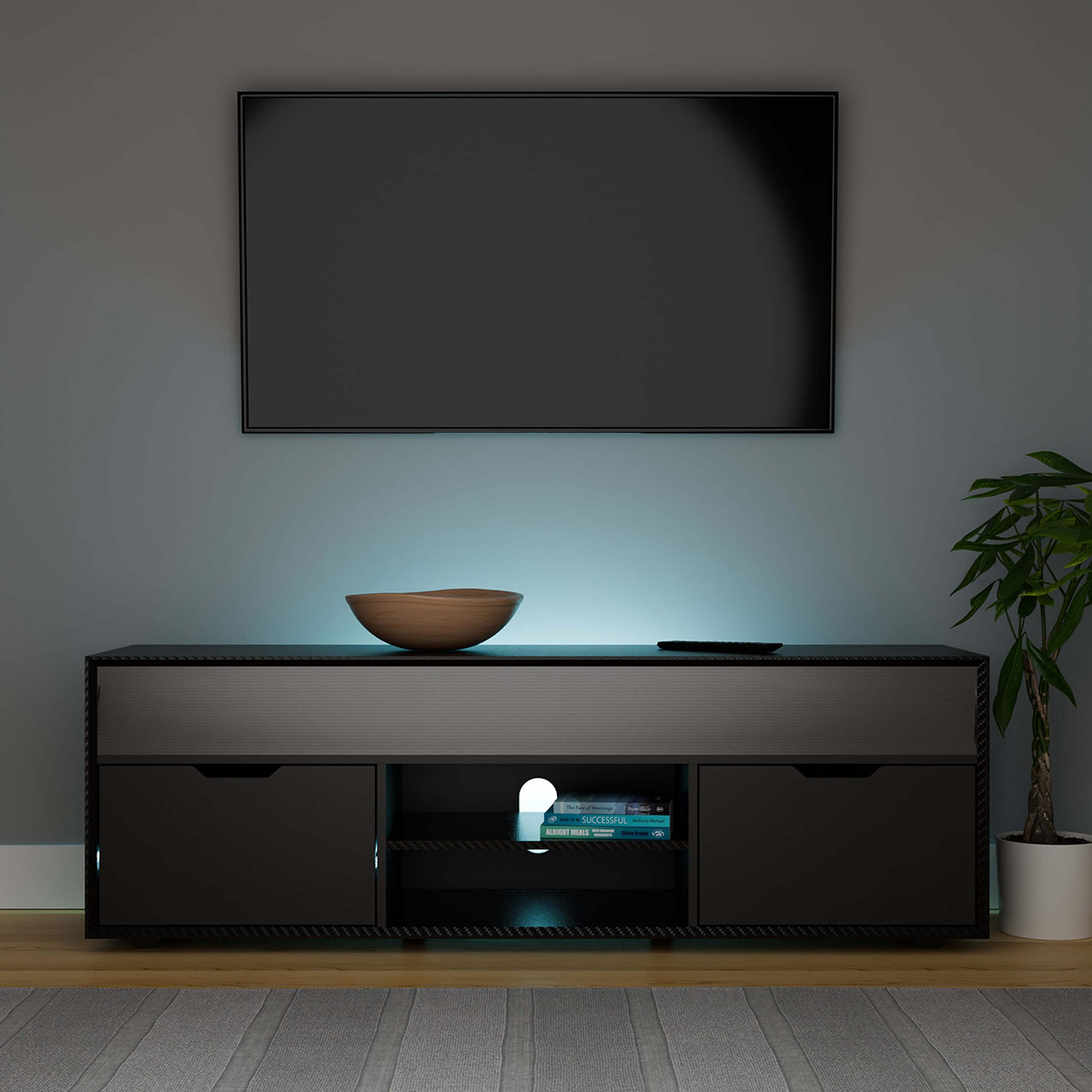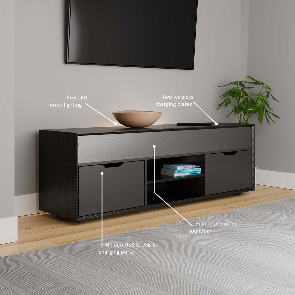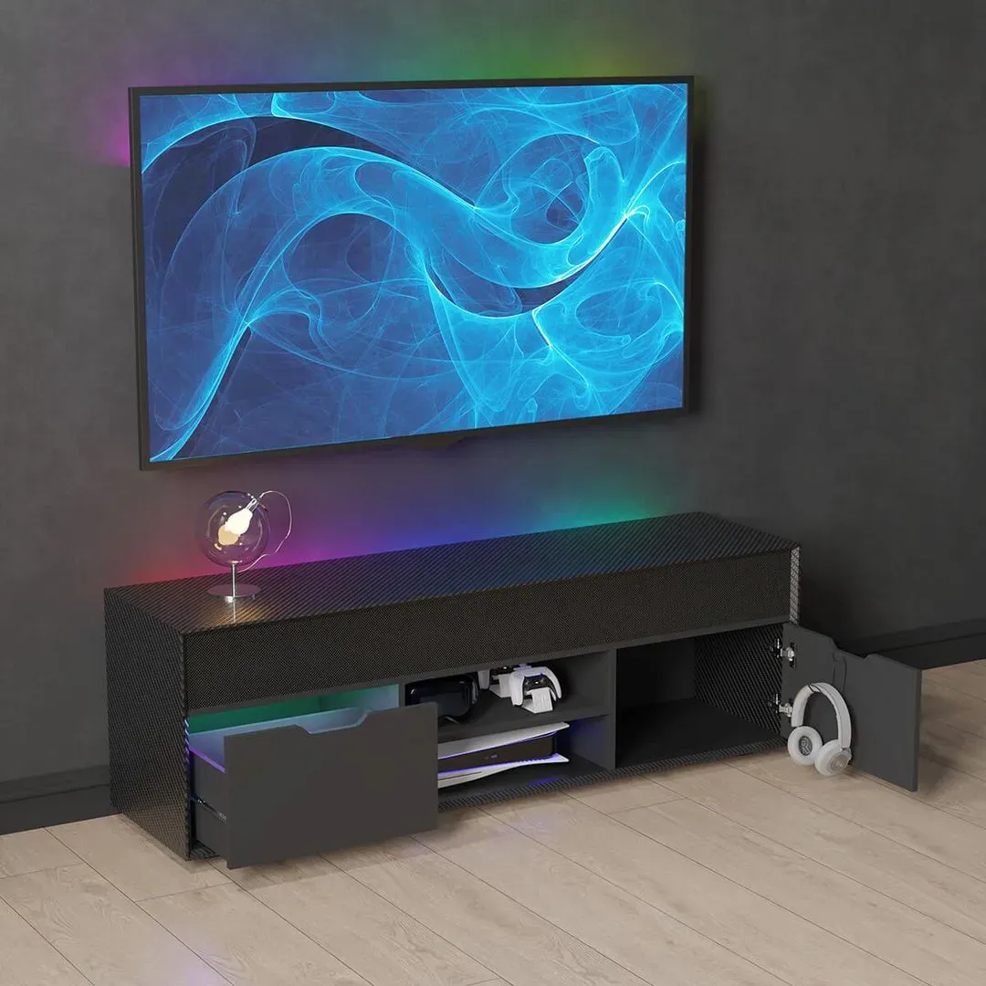 Step up your home entertainment with the Shadow Smart TV unit, combining premium functionality with sleek design. Enjoy cinema quality sound from the powerful built-in soundbar, connecting via Bluetooth or direct audio inputs for lag-free performance. Stay organised with integrated USB-A and USB-C charging ports in the drawer, perfect for powering remotes and devices. The adjustable media shelf offers flexible storage for streaming devices, set-top boxes, or consoles. Rear RGB lighting, the Shadow smart TV unit is the ultimate stylish centrepiece for any modern living space.