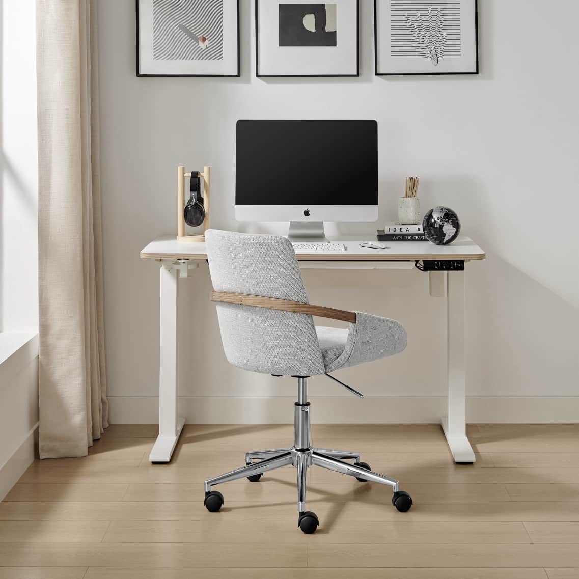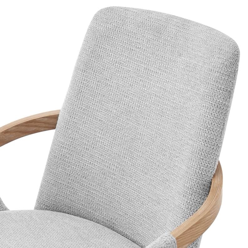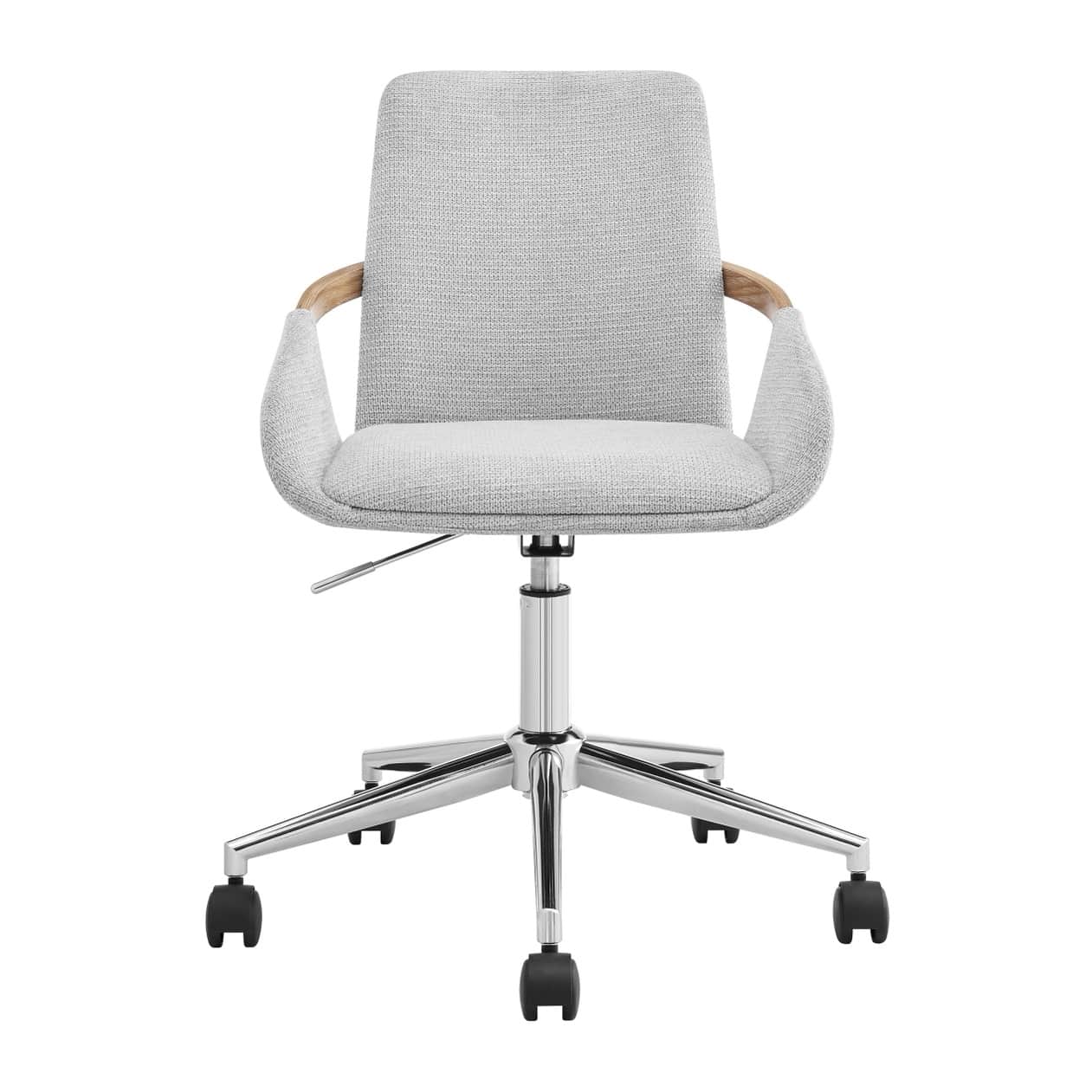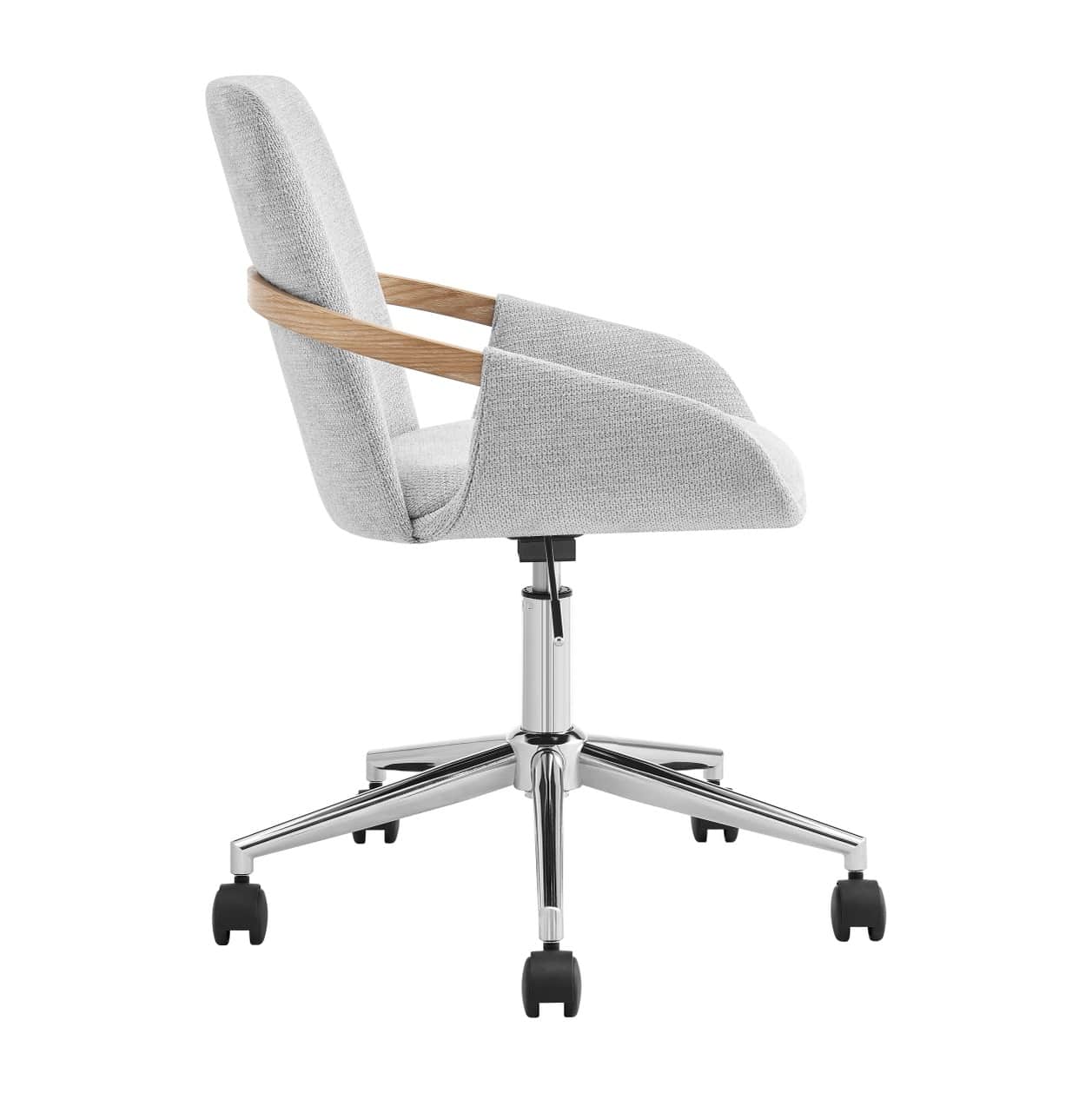 Thea brings sleek sophistication to your workspace with soft grey upholstery, curved armrests accented in natural wood, and a high back for added support. Complete with a chrome base, height adjustment, and castors, ideal for stylish, everyday comfort.