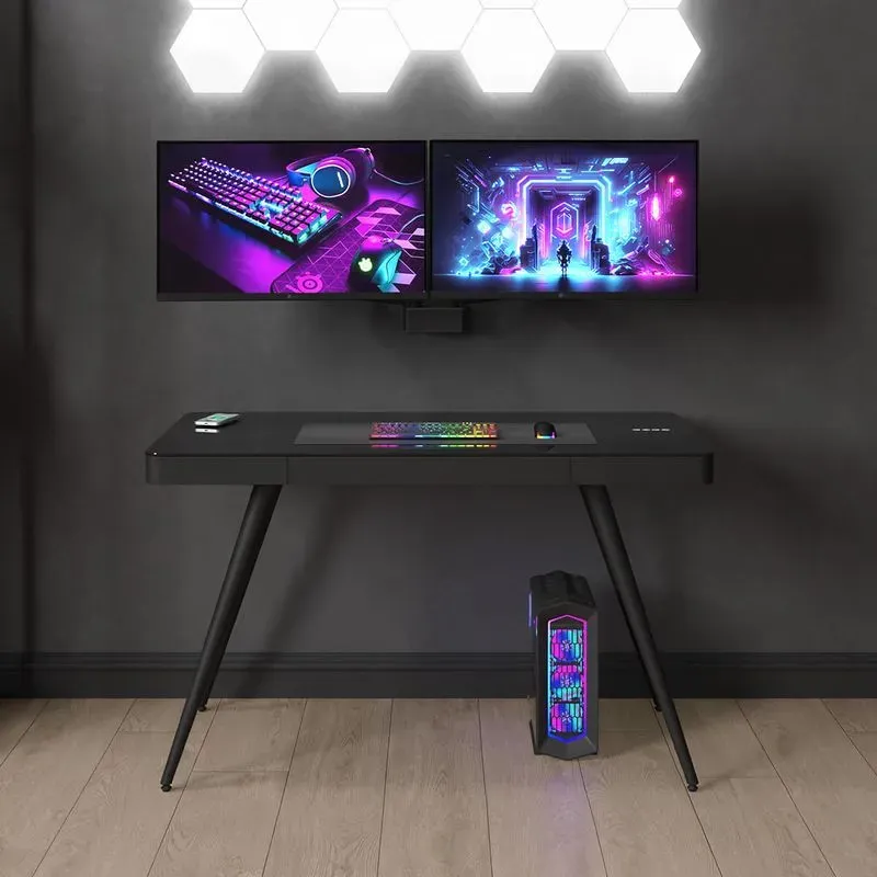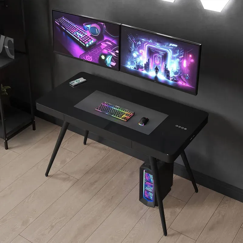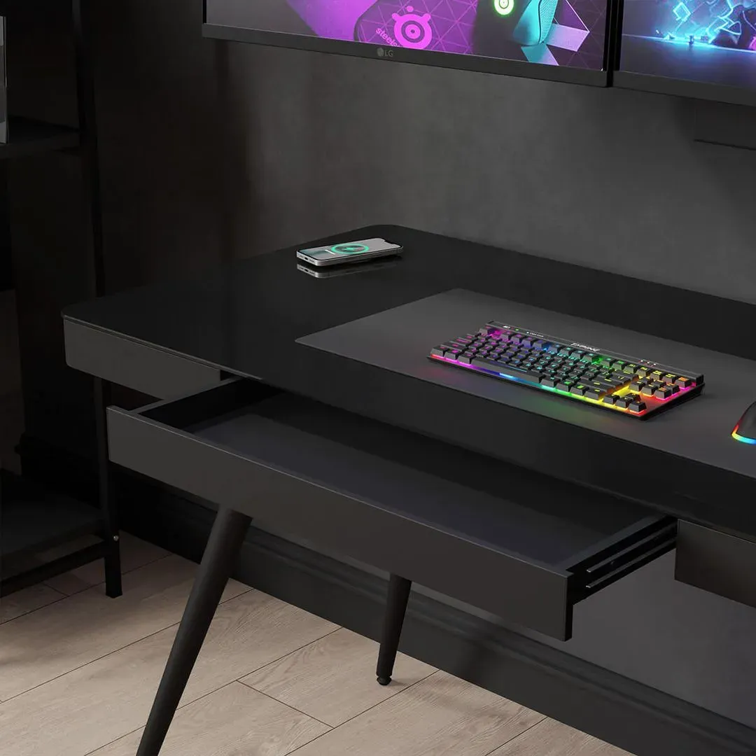The TORI 4.0 Gaming Desk revolutionises workstations with cutting-edge features exclusive to the UK market. It boasts a magnetic charging station and upgraded USB ports for seamless laptop charging, ensuring uninterrupted gameplay. Enhanced Bluetooth speakers, controlled by touch-sensitive buttons, elevate your gaming experience. Its spacious felt-lined drawer keeps your workspace organised, accommodating large laptops and accessories. Finished in sleek midnight black metal and glass, setup is quick and easy, completing in just 10 minutes with two people, allowing more time for gaming domination.