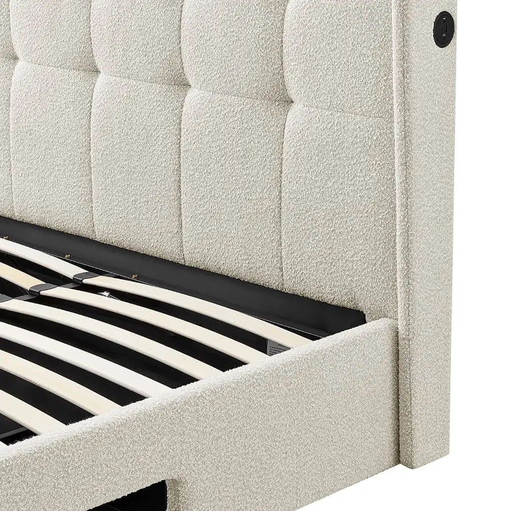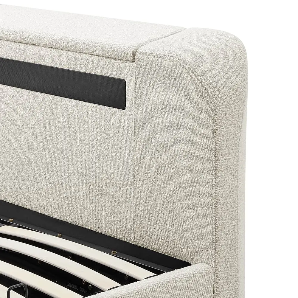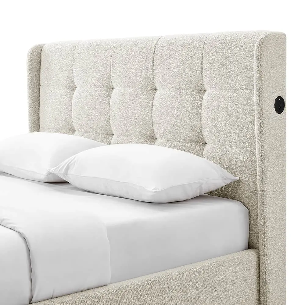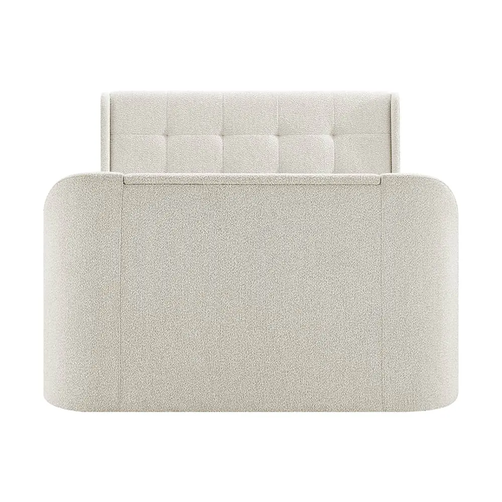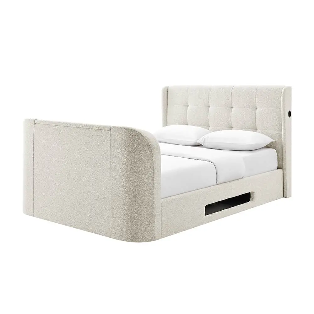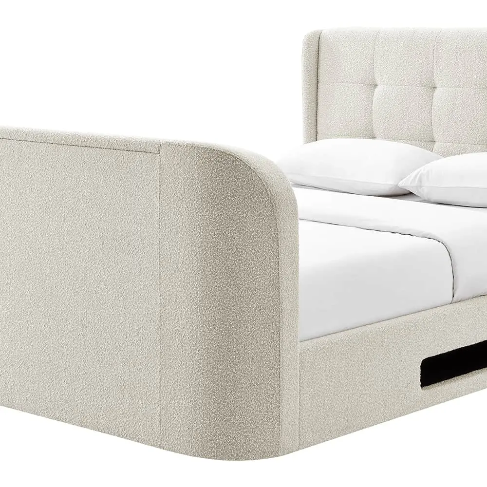 The Wafer Smart TV Bed blends soft-touch comfort with intelligent features, making it the perfect statement piece for any modern bedroom. Upholstered in a luxurious biscuit and cream boucle fabric, the elegant winged headboard adds a timeless touch of style. Available in double and king sizes, the bed includes an electric-lifting footboard that holds TVs up to 43 inches. With an integrated 120W soundbar and subwoofer, plus a headphone jack discreetly placed in the headboard, your entertainment is immersive and effortless. Charging is simple with USB-C ports on both sides, and practical storage is covered thanks to a side-opening gas-lift ottoman base (interchangeable opening side), console storage in the sideboard, and modular interchangeable siderails. Wafer is the perfect mix of cosy luxury and smart functionality. Please note TV & mattress are not included.